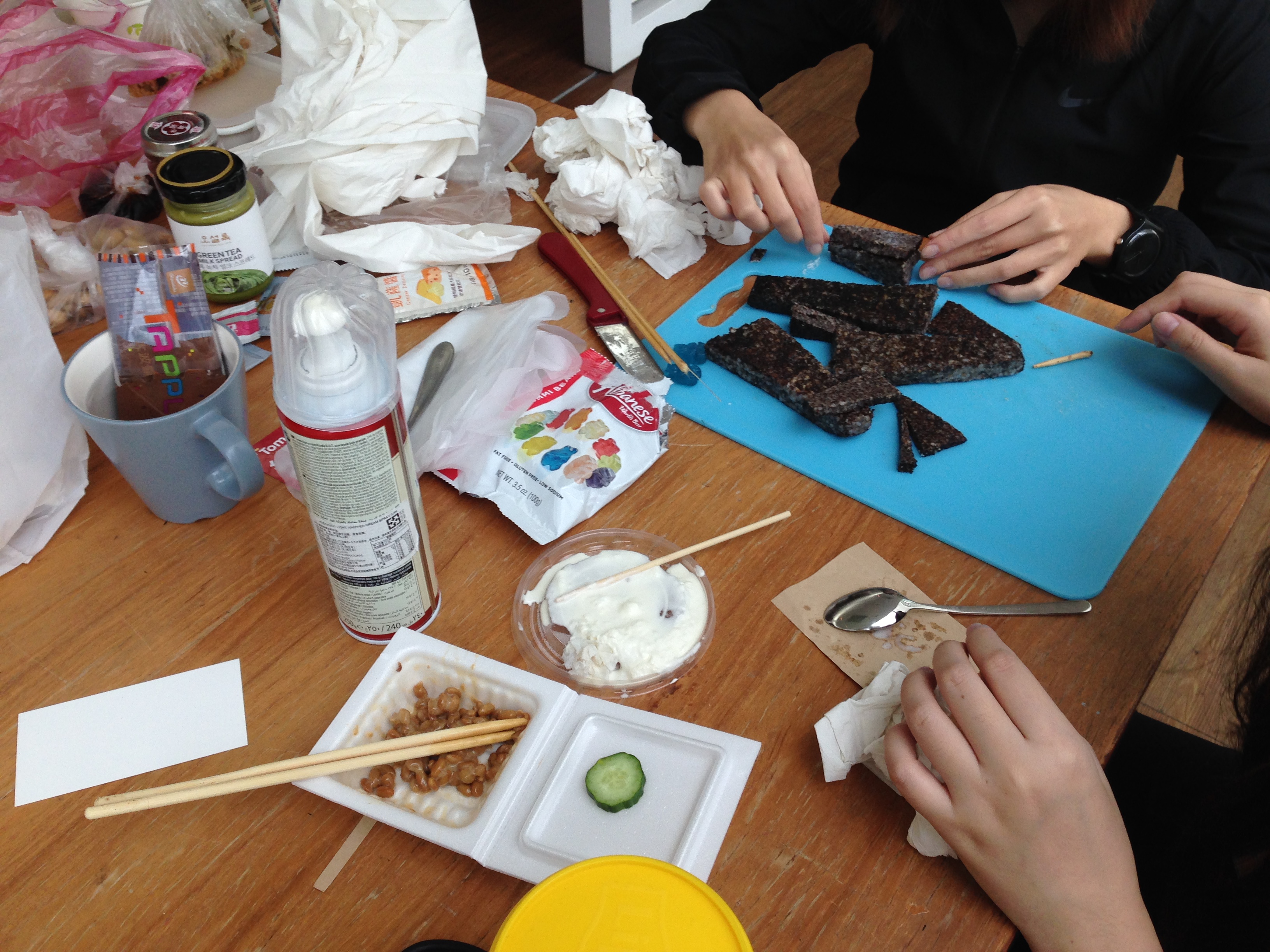 這個作品旨在提出對「道地食物」的反思。我們將異國食物融合各種台灣傳統小吃,